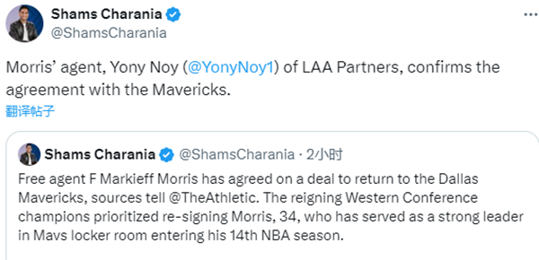 来源:178直播09-08 12:02178直播讯 北京时间9月8日,据名记shams报道,35岁的自由球员前锋马基夫-莫里斯已经同意与独行侠达成一份合同,作为上赛季的西部冠军,独行侠优先考虑与其续约;大莫将在独行侠开启生涯第14个赛季,预计他将继续担任球队更衣室领袖的角色。