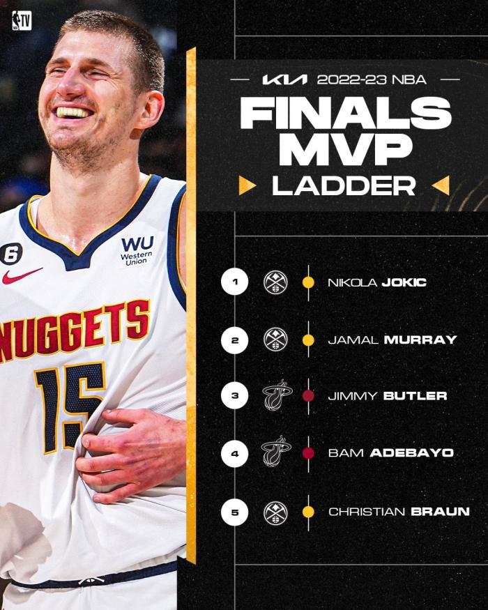 来源:178直播06-09 10:54178直播06月09日总决赛G3掘金大胜热火,掘金大比分2-1领先之后,NBA官方更新最新一期FMVP排名,约基奇继续位居第一,穆雷重返第二,掘金菜鸟布劳恩首次上榜。