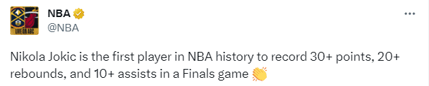 6、约基奇成为NBA史上第一位在总决赛拿到30+20+10三双的球员 7、约基奇成历史第一位在前三次总决赛中2次拿到三双的球员8、约基奇生涯第3次在季后赛中砍下30+20+10,而在NBA季后赛历史中,除了约基奇之外,一共只出现过两次单场30+20+10的表现,分别是贾巴尔和张伯伦各一场。