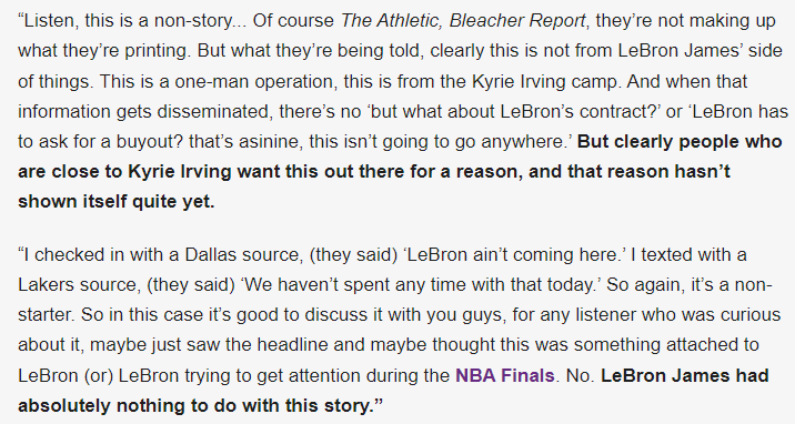 “我和独行侠的消息人士确认过,他们说,‘勒布朗不会来这里。’我给湖人的消息人士发了短信,他们说,‘我们今天没有花时间讨论这件事。’所以,还是那句话,这是不可能的。所以在这种情况下,和你们讨论一下是很好的,对于任何对此感到好奇的听众来说,也许只是看到了标题,也许他们会认为这是和勒布朗有关的或者勒布朗试图在NBA总决赛期间吸引关注度的事情。不。勒布朗-詹姆斯和这则报道完全没有关系。