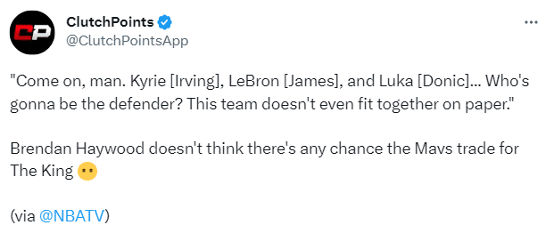 对于詹姆斯、欧文和东契奇可能在独行侠聚首,前NBA球员布兰登-海伍德在节目中表示:别扯了兄弟,欧文,詹姆斯,东契奇,三个持球大核,谁去防守啊?这球队就从纸面阵容上来看都不搭。