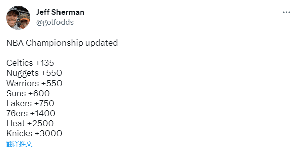 最新夺冠赔率出炉:湖人第五凯尔特人位居第一 勇士掘金并列第二