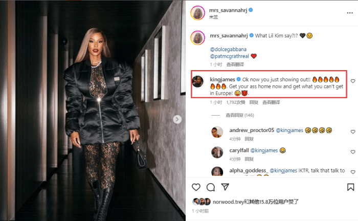 此前萨瓦娜身穿灰色西装亮相时,詹姆斯转发这一组照片,并且写道:米兰说他们需要一些温热的空气,所以,他们迎来了一团火,你的美丽从头到脚,女王太给力了。