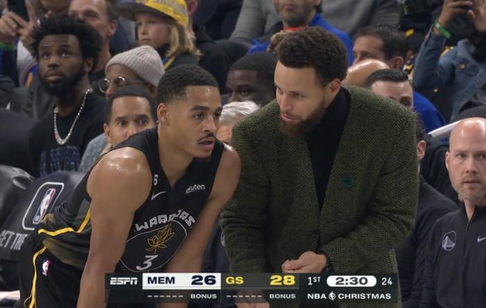 来源:178直播12-26 11:20178直播12月26日讯 ,NBA年终大战勇士对阵灰熊,库里因左肩半脱位的伤势而缺席比赛,库里身穿便装坐在场边观战,期间库里化身库指导,勇士领袖指导普尔一幕引热议。