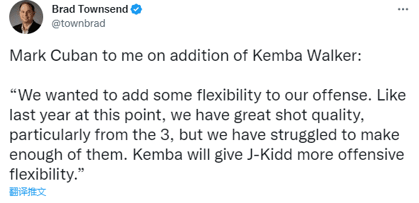 对于签约沃克,此前独行侠老板库班曾表示:我们想给我们的进攻增加一些灵活性,与去年的这个时候类似,我们拥有不错的投手,特别是三分射手,但我们很难命中足够的投篮。肯巴-沃克将给基德提供更多的进攻灵活性。