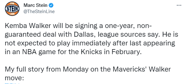 据名记marc Stein报道,肯巴-沃克和独行侠签一份为期一年的无保障合同,并且他不会立刻出场比赛。