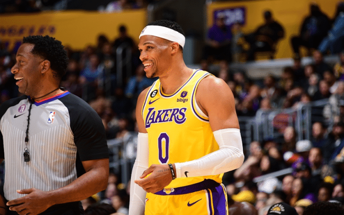 下半场,詹姆斯第三节仅仅投进一记三分,老詹休息时,浓眉和威少带队打出一波疯狂的进攻,浓眉保护篮板,威少、纳恩、小布朗都轰进三分,三节打完湖人领先9分,期间威少打开心了,金鸡独立后仰跳投,威少做出经典的哄娃娃庆祝动作,威少还疯狂跳舞庆祝点燃球馆。