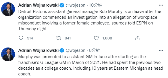 如今墨菲因与活塞女性职员发生不正当关系,被球队调查并且被迫休假。