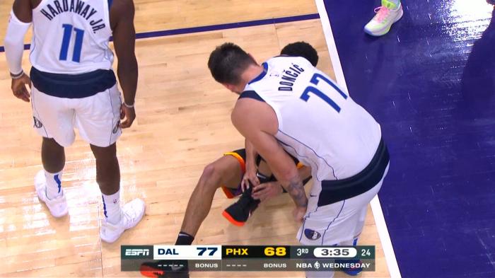 值得一提的是,第三节3分多钟,布克突破时不幸崴脚倒地,东契奇第一时间过来问候布克的伤情,如此一幕太暖心。