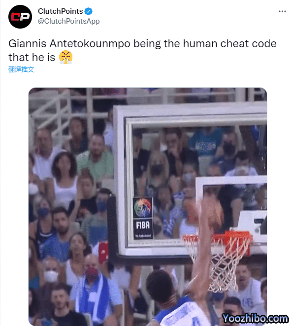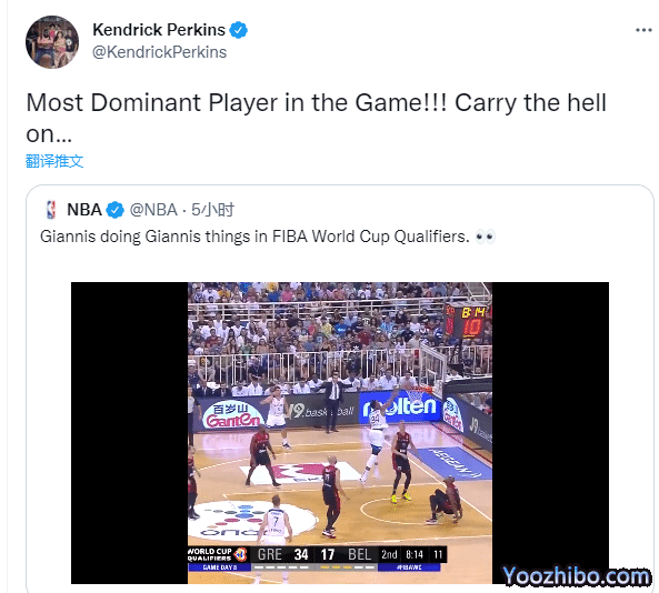 字母哥残暴一扣引热议,NBA官方转发写道:扬尼斯在FIBA世预赛中做了他该做的事情;美媒刷屏转发,Clutch Points发推写道:扬尼斯-安德托昆博是人类作弊代码;名嘴帕金斯直言:篮球场上最具统治力的球员。