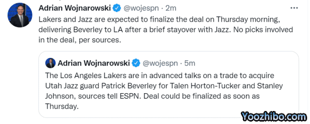 湖人爵士2换1交易达成!贝弗利联手三巨头 塔克约翰逊前往盐湖城
