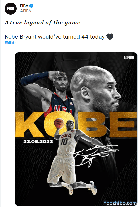 Slam发推直言科比永恒,FIBA官方晒科比身穿美国队10号球衣照,配文写道:真正的传奇,科比今天44岁了,还写道:我们想你了。