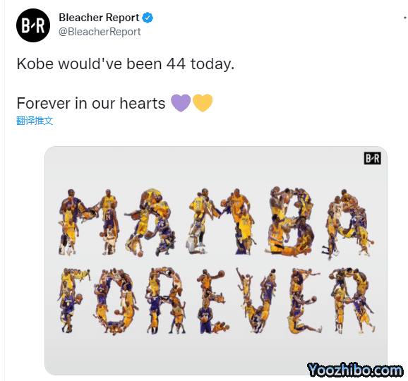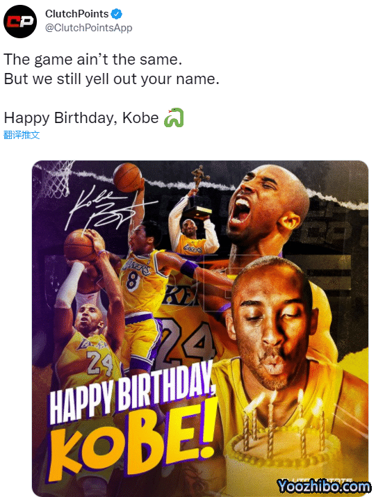 NBA TV晒出科比生涯最经典的24个画面,配文写道:科比44岁生日快乐,曼巴永恒;Clutch Points晒图并且发推写道:比赛不一样了,但我们还是想高喊你的名字;科比,生日快乐;Bleacher Report用科比身穿湖人球衣的赛场照,合成曼巴永恒的照片,配文写道:科比永远都在我们的心中。