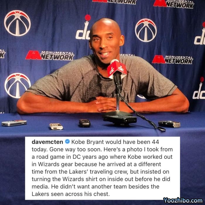 名记Dave McMenamin曝科比昔日往事,晒照并且写道:科比·布莱恩特已经44岁了。走得太快了。这是我几年前在华盛顿的一场客场比赛中拍摄的一张照片,当时科比穿着奇才队训练服,接受采访时,科比坚持翻穿奇才队球衣,因为他不想看到除了湖人之外的另一支球队。