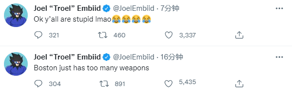 恩比德还发推写道:波士顿的进攻武器太多了;又发推疑似回应球迷:好吧,你们都是笨蛋。