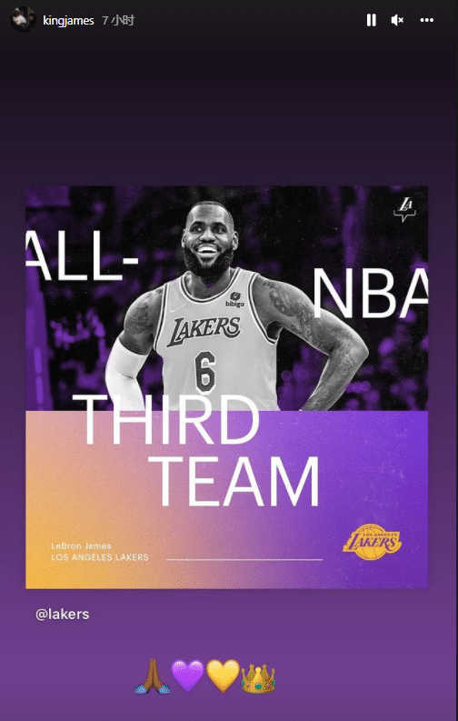 来源:178直播05-26 10:51178直播05月26日讯 湖人球星詹姆斯更新社交媒体,转发湖人官媒动态,庆祝自己入选最佳三阵;老詹先是转发湖人庆祝他入选最佳三阵的动态,配上爱心和王冠表情;湖人官方晒詹姆斯本赛季隔扣乐福、轰进三分以及大帽对手的精彩画面,并写道:史上第一位第19个赛季入选最佳阵容的球员,为国王欢呼!