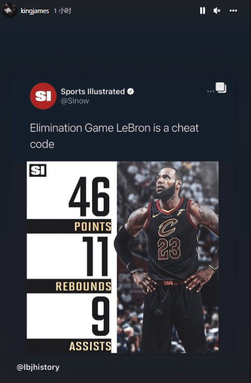 目前NBA季后赛已经打到分区决赛,4年前的今天,在骑士与凯尔特人东决G6生死战中,詹姆斯全场仅歇2分钟轰下46分11篮板9助攻且命中率高达52%,把系列赛拖进抢七;美媒直呼面临淘汰赛的詹姆斯是一个作弊密码,詹姆斯转发自己曾经的疯狂表现。
