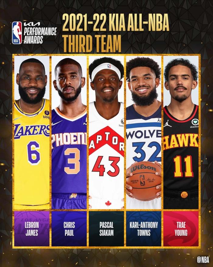 此前NBA已经公布了本赛季最佳阵容,字母哥、布克、东契奇、塔图姆和约基奇入选最佳一阵;杜兰特、恩比德、莫兰特、库里和德罗赞入选最佳二阵;詹姆斯、保罗、西亚卡姆、特雷杨和唐斯入选最佳三阵;其中37岁詹姆斯获得2张第一选票,35张第二选票和54张第三选票,总共169分。