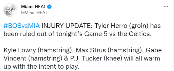 热火官方还宣布洛瑞(腿筋)、斯特鲁斯(腿筋)、文森特(腿筋)和 PJ-塔克(膝盖)都倾向于出战东决G5;目前热火和凯尔特人打成2-2平,据统计,拿下天王山的球队有81.8%的概率赢下系列赛。