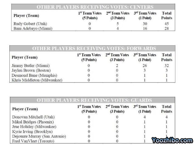 有球迷调侃哈登:贝恩的票数都比你多。灰熊的贝恩在今年的最佳阵容投票中获得了一张第三阵容的票数,得到1分。另外,兼职作战的欧文都得到1票。