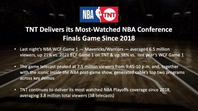 来源:178直播05-20 14:43178直播05月20日讯,TNT公布了西决首战的收视率。据报道,这场比赛的平均收视人数为650万人,比2021年的东决G1提升21%,比去年的西决G1提升38%。当地时间晚上9点45分至10点,收视人数来到最高的750万人,该场比赛与之后的《Inside the NBA》节目一起成为了当日有线电视频道中收视率最高的两档节目。