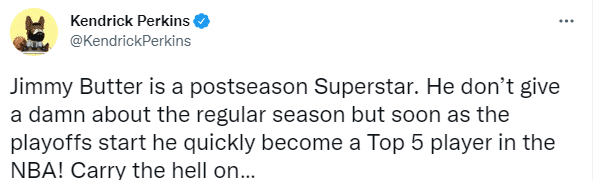 名嘴帕金斯盛赞巴特勒:巴特勒是季后赛超级巨星,他不在乎常规赛,一旦到了季后赛,他就是NBA前五级别的球员。