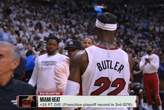 巴特勒单节17分3抢断,一个人得分比凯尔特人第三节全队还多,攻防一体统治比赛,期间巴特勒更是露出王之蔑视的霸气表情;热火单节狂赢25分创队史季后赛第三节最多赢球分差。