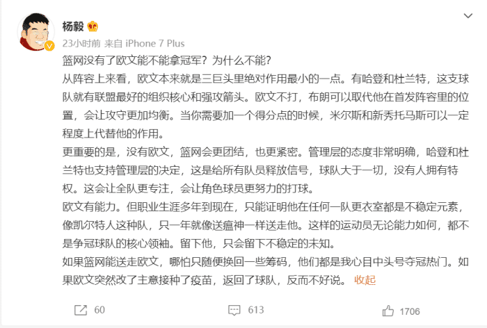 而且能让角色球员获得更多的机会,布鲁斯布朗、米尔斯等等也都能得分,换句话说篮网这个决定做得好,在常规赛前解决了,球队往前看继续前进,至于欧文,到底打不打这个赛季慢慢看吧!