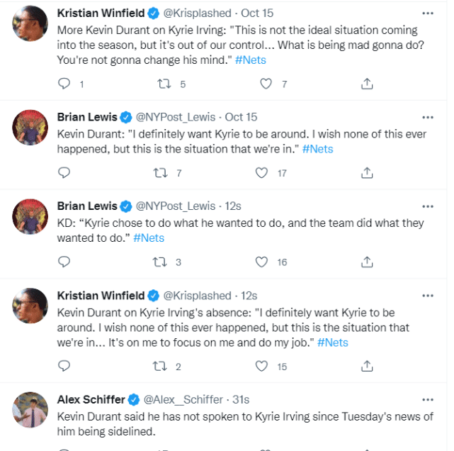 此前,哈登已经在欧文禁赛后正式回应,他表示从那以后还没和欧文说过话。没想到与欧文关系更密切的杜兰特,也是如此。杜兰特在采访中承认,自己在篮网官宣决定后也没和欧文联系过。昨天,欧文在社媒直播发表观点时,有球迷发现杜兰特也在线观看了那次直播,但全程保持沉默。