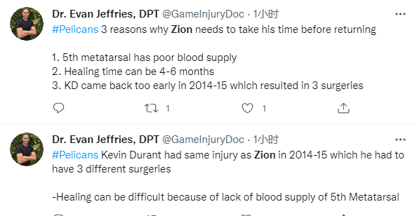 医学专家Evan Jeffries跟进报道,在复出之前,锡安需要慢慢养伤的三个原因——一是第五跖骨供血不足;二是实际上愈合时间是4-6个月;三是杜兰特曾在14-15赛季受过这样的伤,由于复出太早,导致杜兰特又接受了三次手术。