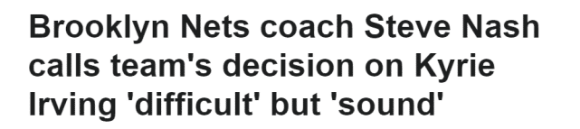 一天前,篮网官方宣布,在欧文符合纽约防疫规定(接种疫苗)前,他将不会参加球队的训练和比赛。换句话说,篮网禁赛了拒绝接种疫苗的欧文。“每个人都有他们的见解,”纳什说,“像那样的一个决定,需要时间。这是一个艰难的决定,但我认为这也是一个合理的决定,一个对所有人都有意义的决定。”