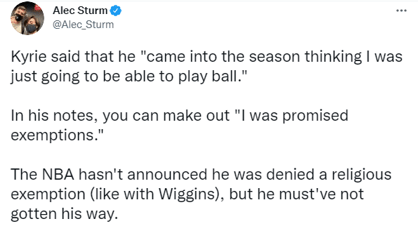 欧文表示他随时准备归队争夺总冠军,在直播中,欧文还晒出自己的笔记,篮网记者Alec Sturm看到欧文笔记中写着:;目前NBA官方还没宣布剥夺欧文的宗教豁免权,也没有欧文申请拒绝接种豁免权的消息,此前勇士球星维金斯申请豁免遭拒绝,之后他被迫接种了疫苗。