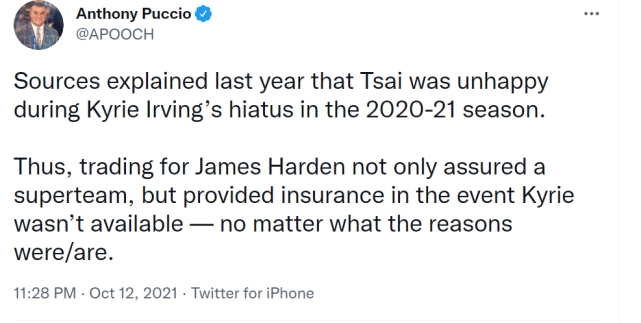 来源:178直播10-13 19:32178直播10月13日讯 ,篮网记者Anthony Puccio报道称,消息源透露,早在2020-21赛季,欧文因故缺席比赛时,篮网老板蔡崇信就已经不高兴了。他同意球队换来哈登,一方面是为了打造超级球队,另一方面就是为欧文准备一份保险,不管他未来因为什么原因缺席。