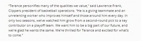 对于续约曼恩,快船篮球运营总裁劳伦斯-弗兰克表示:曼恩身上体现了许多我们所看重的品质。他是一位乐于帮助队友并且在训练中坚持不懈的球员,他每天都在让自己和身边的人共同进步。