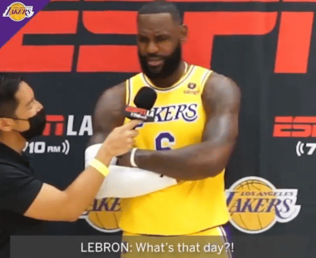 此前有记者询问詹姆斯:“10月11日(美国当地时间),那个日子对你有何意义?”詹姆斯没反应过来,反问道:“那天是什么日子?”经提醒后,詹姆斯说:“哦,明白了!听着,我总是向前进,从不陷入过去发生什么,我想知道未来几次夺冠的日子是哪天。谢谢你提醒我,那是很棒的一天。能够成为湖人历史的一部分,能够举起奥布莱恩奖杯,因为那就是这里关心的东西。这里只关注赢球,以及在最高水准上赢球。”