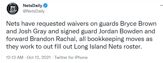 来源:178直播10-12 14:54178直播10月12日讯 ,据篮网媒体NetsDaily报道,篮网签下后卫乔丹-鲍登和前锋布兰登-雷查尔,裁掉了一天前签下的布莱斯-布朗和约什-格雷。新签的两名球员预计也会被裁掉,四人都将加入篮网下属的G联赛球队,成为新赛季的备胎。