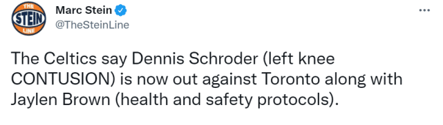 来源:178直播10-10 11:27178直播10月10日讯 ,NBA季前赛继续进行,凯尔特人主场迎战猛龙。赛前,名记马克-斯坦恩报道,绿军后卫丹尼斯-施罗德因左膝挫伤,缺席本场比赛,而因新冠检测阳性的杰伦-布朗目前仍在隔离中。绿军官方也更新了布朗的状况:主帅尤杜卡表示,布朗很可能无缘余下的季前赛,但他希望布朗能赶得上常规赛揭幕战。