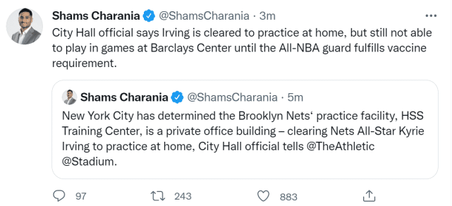 来源:178直播10-09 16:54178直播10月09日讯 ,据名记查拉尼亚报道,纽约市政厅的官员透露,纽约市已经认定篮网的训练场馆(HSS训练中心)是一个私人办公设施,这意味着欧文可以回归进行训练。不过,市政厅的官员也表示,如果无法达到接种疫苗的要求,欧文依然不能在篮网主场巴克莱中心打比赛。