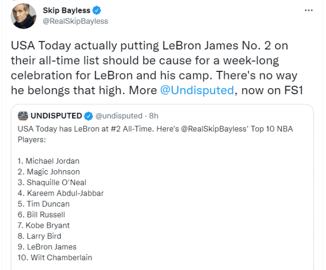 来源:178直播10-09 16:52178直播10月09日讯 ,NBA知名评论员斯基普-贝勒斯在节目上谈论《今日美国》的75大巨星排名。《今日美国》将詹姆斯排在历史第二,仅次于乔丹,而贝勒斯公布了自己心中的前十排名,詹姆斯竟然只被他放在第九。