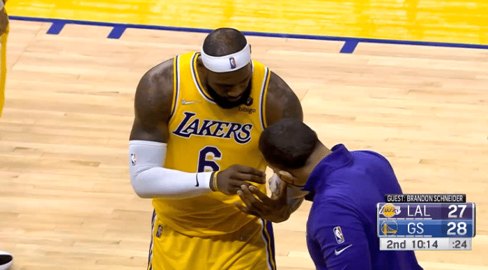 首节比赛,詹姆斯开场5投0中狂打铁,由于长时间不打比赛,投篮手感糟糕,不过下场休息回来后,詹姆斯连续打进两球——反击中撞倒勇士悍将安德森并且打成2+1,之后用迎着防守投进后仰跳投;威少迎来湖人首秀,状态也十分糟糕,第一节2中0没有得分进账却有多达6次失误。
