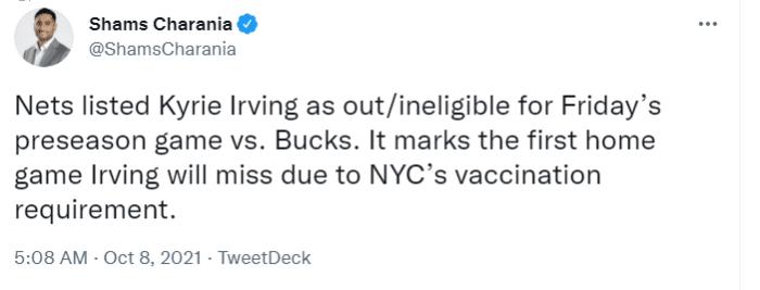 明日篮网与雄鹿的比赛,欧文仍不会登场,据名记Shams报道,篮网已将欧文的本场出场状态列为缺阵/不符合出场条件。这将是欧文第一次因不符合规定而缺席主场比赛,也就是损失钱财从这个时候开始了。按照联盟的规定因为没打疫苗无法出战比赛的,他们相应的薪水也不会发放!