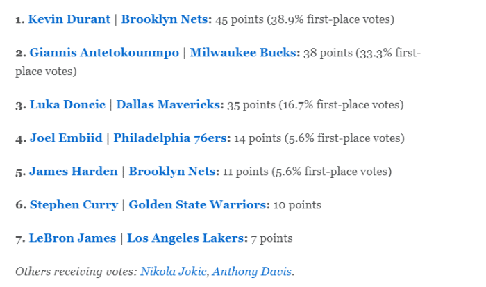 1. 杜兰特45分(38.9%的第一选票)、2.字母哥38分、3.东契奇35分、4.恩比德14分、5.哈登11分、6.库里10分、7.詹姆斯7分。其他得到票数的球员:约基奇、浓眉。