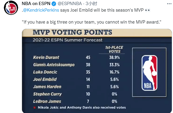 ESPN专家预测MVP!杜兰特力压众星排第一,9人上榜詹皇仅7分