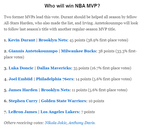 在ESPN专家们看来,杜兰特是新赛季常规赛MVP的头号热门候选人,字母哥38分排名第二,东契奇35分排第三,而36岁詹姆斯上榜却仅拿7分;从投票结果来看,共有9名球员获得选票,湖人和篮网都有两人上榜,另外五人都是各支球队的核心领袖。