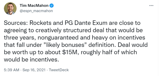 来源:178直播09-16 11:05178直播9月16日讯 ,据名记Tim MacMahon报道,消息人士透露,火箭与埃克萨姆接近达成一份3年1500万美元的无保障合同。这份合同很特别,三年无保障,总金额近一半为非常可能得到的奖金,因此,当埃克萨姆被交易时,奖金可以被计入工资。这些奖金将主要基于他的平均上场时间及比赛正负值。