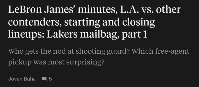 来源:178直播09-15 14:42178直播9月15日讯 ,湖人跟队记者Jovan Buha撰文回答了球迷的多个问题,解析了目前球队的五大悬念。湖人现有的实力能排联盟第几?新赛季詹姆斯场均会打多长时间?湖人的首发和轮换是怎样的?Buha都给出了他的答案——
