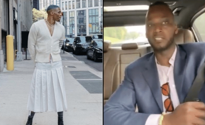 夸梅布朗点评的是此前威少的装备,一直被认为是时尚达人的威少,近期穿了白裙子和黑靴子进行街拍,而且还把头发染成了蓝色!他今日在出席MetGala红毯前接受了采访表示“蓝色是我最喜欢的颜色,夏休期里我有点无聊,在赛季期间,你处于比赛之中的模式,不太关注这些。但是在红毯之上,你非常关注你的站姿,你的外表。比如你的服装上身效果如何”