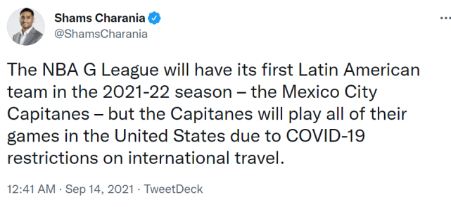 来源:178直播09-14 09:53178直播9月14日讯,据名记查拉尼亚报道,NBA发展联盟(G联赛)将在下赛季迎来第一支拉丁美洲的球队——墨西哥城卡皮坦内斯(Mexico City Capitanes)。由于疫情防控的原因,卡皮坦内斯队下赛季的比赛将都会在美国境内进行。