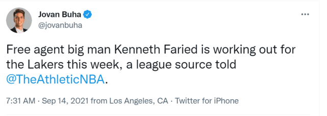 来源:178直播09-14 09:51178直播9月14日讯,据The Athletic湖人记者Jovan Buha报道,联盟消息人士透露,自由球员“半兽人”肯尼斯-法里德本周将为湖人进行试训。