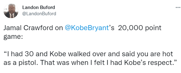 谈到当年科比20000分里程碑之夜,克劳福德表示:我拿到了30分,然后科比走过来对我说:你像手枪一样的火热;那时候我觉得我得到了科比的尊重。